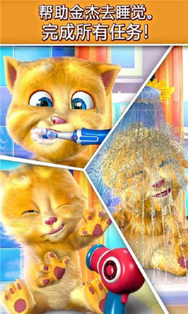 日常照料是维系与金杰猫关系的重要环节。主界面提供了清晰的功能入口,点击浴缸图标即可进入清洁模式。在此模式下,需要按照提示顺序使用淋浴、毛巾和吹风机等工具,完成全套清洁流程。每一次正确的操作都会伴随金杰猫愉悦的反应与相应的动画,完成全部步骤还能收获满意度反馈。同样,定时进行喂食或安排就寝,都能维持良好的状态。