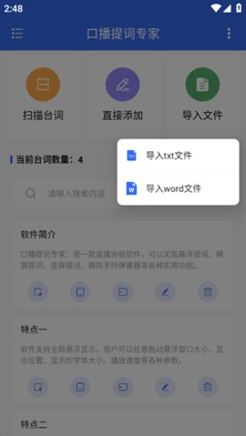 支持从外部导入TXT等常见文本格式文件,作为台词稿的直接来源,方便用户将已在电脑或其他设备上撰写好的文稿快速迁移至移动创作环境。