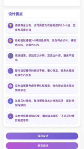 软件建立了详尽的植物数据库,涵盖常见与珍稀花材,每种均提供高清图片、学名、花语、季节特性及养护要点等专业信息,是随身的花卉百科全书。