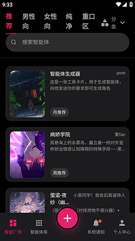 智能广场作为内容聚合中心,集中展示了所有可互动的AI角色。每个角色卡片都附有精炼的性格简介与故事背景,方便用户快速浏览并发现潜在的兴趣点,是开启互动之旅的起点。