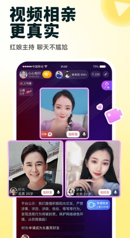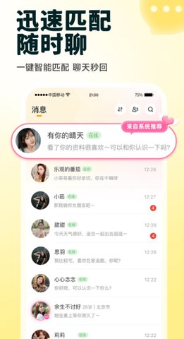 20交友是一款专为年轻用户设计的移动社交软件,通过实时位置服务和真人互动机制,缩短陌生人之间的社交距离。软件内聚集了大量经过基础身份核验的真实用户,他们以在线状态分享生活瞬间,并可通过文字、语音等多种方式进行即时交流,为现代都市青年提供了一种高效、直接的社交连接方式,丰富了日常人际交往的可能性。