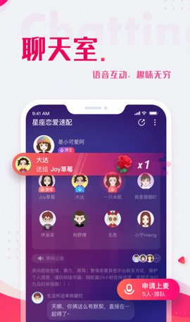 界面布局清晰,功能路径直观,从选择兴趣到开始聊天步骤明确,没有冗余元素干扰,用户能快速理解并投入到核心的社交互动中。