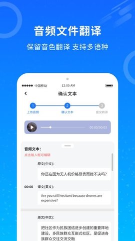 支持导入本地存储的MP4、MOV、MP3、M4A等多种常见格式文件,自动完成语音到文字的转换,生成原始语言文本。