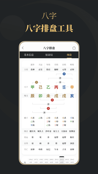 四柱八字排盘展示原命局的天干地支、十神、藏干,更提供详尽的细盘信息查询,包括大运、流年、流月、流日的干支作用及地支间的刑冲合害关系网络。