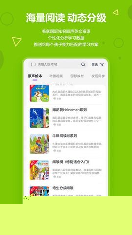 内容库涵盖海量经过科学分级的原版英语绘本,严格匹配不同年龄阶段儿童的认知水平与语言发展规律,确保学习材料的适宜性与渐进性。