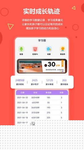 自动追踪并记录阅读时长、跟读次数、得分趋势等关键学习行为数据,通过清晰的图表呈现长期学习轨迹与进步曲线,让学习成果一目了然。