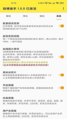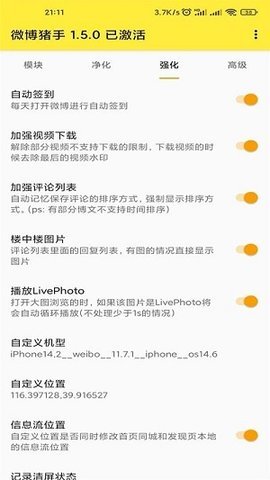 提供可视化控件管理面板,用户可自由调整微博首页Tab栏顺序、隐藏发现页热门话题榜、关闭视频自动播放等二十余项显示参数。