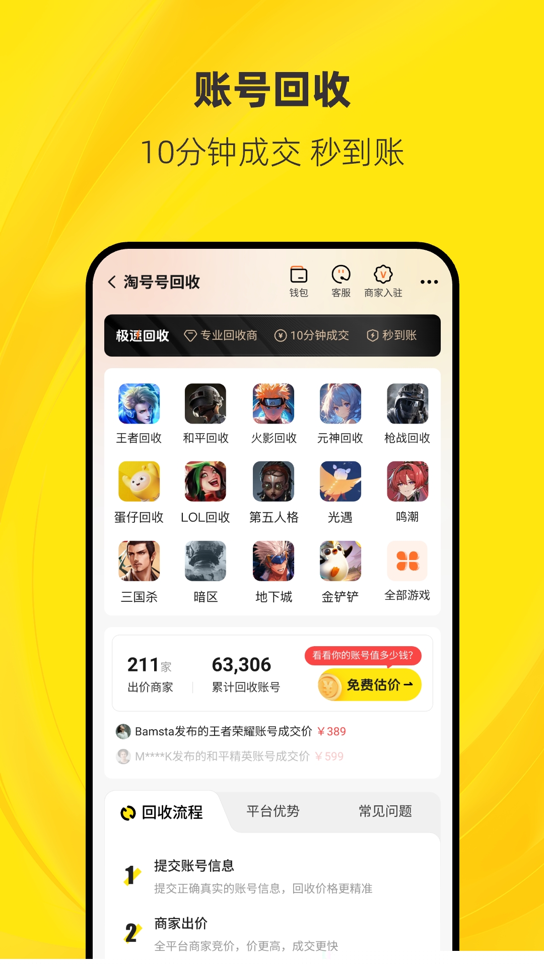集成专业的账号估值与快速回收系统,支持卖家在短时间内完成账号评估并实现即时交易收款,为提供便捷的脱坑变现通道。