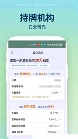 用户完成基础信息填写后,系统会基于多维数据模型实时测算出一个可用的信用额度,让用户在提交正式借款申请前对自身借贷能力有明确预期。