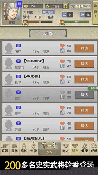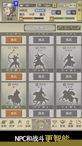 从零岁起步,逐年成长,需分配有限的行动点数进行读书、习武、社交等活动,属性积累直接影响后续的官职晋升、势力选择与资源获取,完整模拟古代人生的各个阶段。