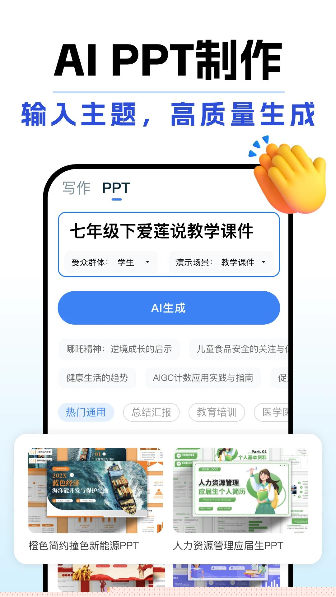 根据输入主题自动生成结构完整、视觉元素丰富的演示文稿,并支持添加动态过渡与视觉特效,满足高标准商业演示与学术汇报需求。