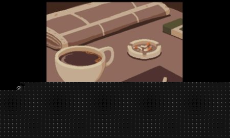像素画面融合了九十年代日本动画的视觉元素,整体色调偏冷,但咖啡馆内的灯光与饮品细节又透出暖意。