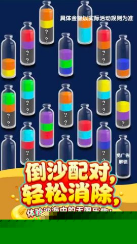 核心目标是整理屏幕上所有装有彩色沙粒的玻璃瓶,使得每个瓶子内最终仅包含一种颜色的沙粒。当某一瓶被同色沙粒完全填满时,该瓶会被清空并视为成功消除,获得分数。整个过程考验对颜色分布的整体观察与步骤预判能力。