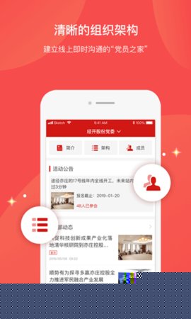 模拟真实党组织层级关系建立线上支部,党员可快速定位所属组织,便捷参与支部事务、查看成员动态。