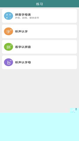 从首页进入声韵母学习板块,选择要学习的字母,即可观看发音讲解、聆听标准读音,并跟随示例词组进行拼读练习。