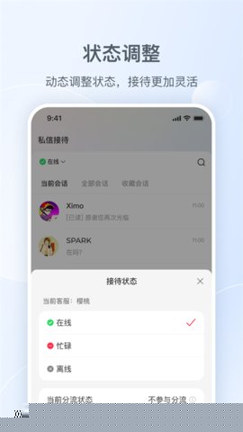 支持多成员协作接待,并可设置个人在线、忙碌或离线等状态,系统能根据状态智能分配咨询流量,有效协调团队人力资源,防止客户咨询被遗漏或重复响应。