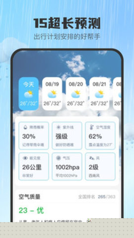 提供未来长达15天的天气趋势展望,清晰展示每日最高最低气温、主要天气现象及风向风力变化,为用户的旅行、出差等中长期日程规划提供关键气象依据。