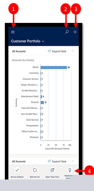 图示说明:1. 站点地图:展开功能菜单,在不同软件间切换,访问收藏夹、最近使用记录及系统设置。2. 搜索:在Microsoft Dataverse中快速检索软件数据行。3. 新建:启动创建新数据行的流程,支持快速录入各类业务信息。4. 助手:提供个性化的可操作见解与日常活动跟踪,通过智能提示卡帮助用户掌握工作动态。