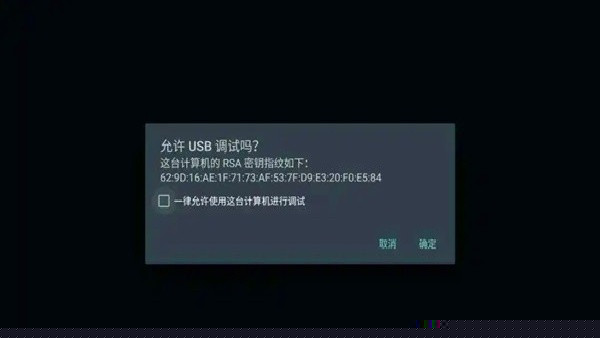 首次连接时,电视屏幕上会出现允许USB调试吗?的授权提示框,请使用遥控器勾选始终允许并确认。如果未弹出,请检查ADB调试是否已成功开启,或尝试重新连接。