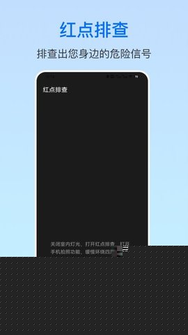 调用智能设备的红外发射器与摄像头,利用绝大多数光学镜头对红外光的强反射特性,在黑暗环境中扫描,可在屏幕上直接显示来自隐藏摄像头镜头的红色光斑,实现物理定位。