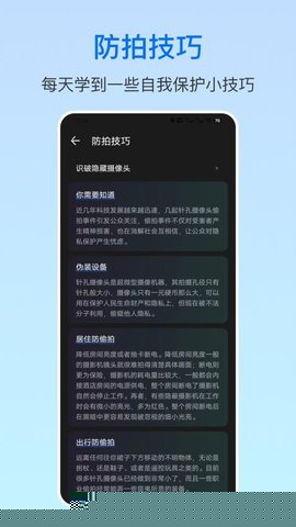 摄像头防偷拍是一款专注于个人隐私空间安全的移动软件,帮助用户在酒店、民宿、出租屋、公共更衣室等隐私敏感场所,快速有效地排查可能存在的非法隐藏摄像设备,通过综合分析无线网络活动、红外光学反射以及电磁信号特征等多种技术手段,对所处环境进行非侵入式扫描,识别并预警异常设备。整个过程设计简洁,用户无需专业知识即可独立完成一次基础环境安全评估,从而在陌生环境中获得更安心的居住与出行体验。