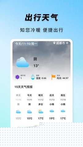 内置天气服务,可针对行程途经或抵达的主要城市,提供未来多日的详细气象预报,便于用户提前做好衣物和物品准备。