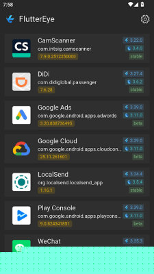 fluttereye是一款专注于移动软件技术栈分析的检测工具,能够高效扫描并识别出安装在设备上的、基于Flutter框架开发的软件,通过解析软件包体的内部结构,为用户提供详尽的技术元数据,是开发者、测试人员和技术爱好者进行软件逆向分析、技术调研和竞品研究的实用辅助软件。