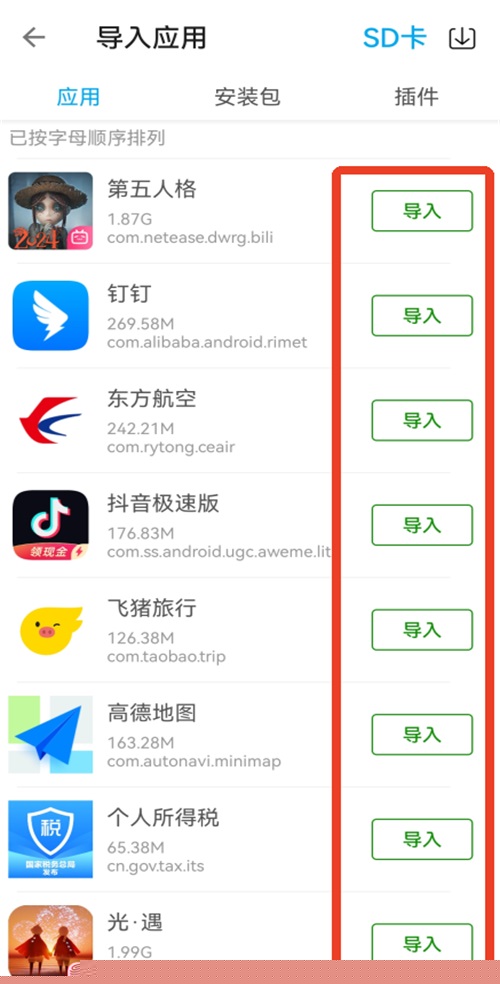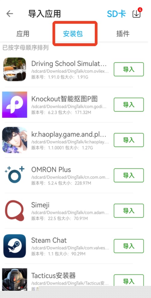 启动软件后,在主界面点击底部+按钮,从列表中选择主机已安装的软件,或切换到安装包标签页导入本地APK文件,点击导入即可自动完成沙箱内的安装与部署。