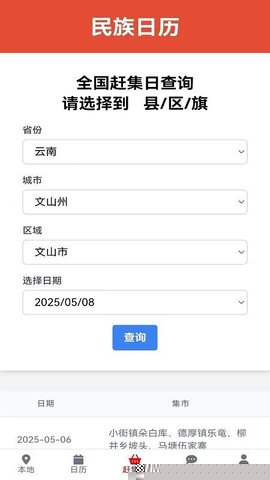 启动软件后,进入赶集日功能模块,依次选择您所在的省份、城市及区县,点击查询即可获得该区域所有集市的详细日期列表,信息支持手动刷新以获取最新动态。