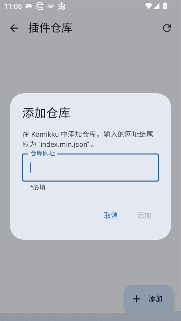在浏览界面进入插件管理,选择添加仓库功能,输入由社区提供的、以.json结尾的仓库地址链接,确认后即可自动获取并安装该仓库内的所有可用漫画源插件。
