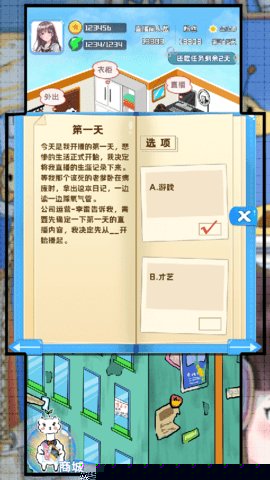主播日记是一款以现代网络直播行业为背景的动漫风格模拟经营作品。将扮演一位新人主播的幕后管理者,在为期一年的虚拟时光里,精心规划每日的直播内容与行程安排。核心体验在于通过策略性的日程管理与实时互动决策,应对直播间内外的各种挑战,逐步积累人气与财富,最终塑造出独具特色的超级主播形象。