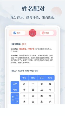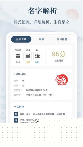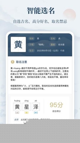 对每一个候选名字提供包括字义溯源、五行属性、生肖宜忌、三才五格、音调搭配在内的全方位解析报告,让命名过程有理有据,知其然更知其然。