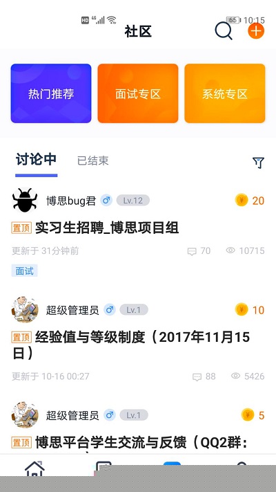 进入社区板块,浏览或搜索感兴趣的专题讨论区,点击进入后即可阅读他人发言,并可直接发表自己的观点、提问或上传相关学习资料进行分享。