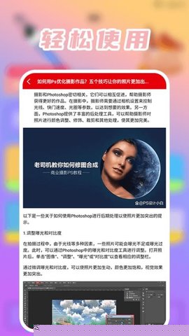 软件内整合了系统化的图文与视频教程,讲解工具用法,更深入剖析摄影后期原理与流行风格打造方法,形成了工具使用-理论提升-风格实践的闭环学习路径,助力用户持续进阶。