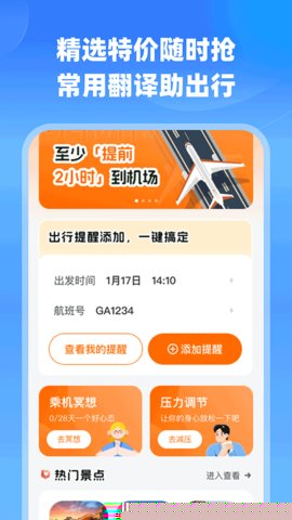 提供个人行程中心,用于收藏关注的航班、管理搜索历史,并可设置出行前的值机提醒、天气查询等。部分版本集成目的地资讯、机场交通指南等多重出行辅助信息,形成从规划到出行的完整服务闭环。