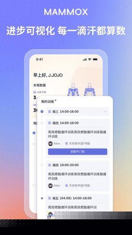 集成化的日历视图清晰展示可预约时段,用户可一键完成私教课程的预约、改期或取消。系统会自动同步教练日程,避免时间冲突,并推送预约确认与提醒通知,简化日程管理流程。