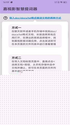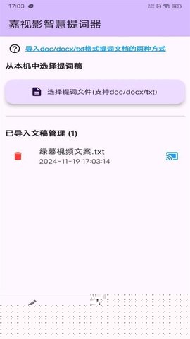 嘉视影提词器兼容主流的文本格式,包括Microsoft Word文档(.doc, .docx)以及纯文本文件(.txt)。直接将这些格式的文件导入,系统会自动提取的文字内容并生成提词稿。