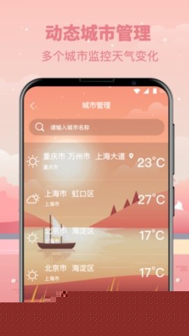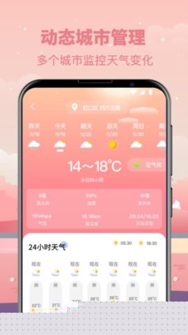 支持用户添加并管理多个国内外城市天气信息,实现一键切换查看,满足差旅、探亲或关注异地天气的需求,信息呈现包含24小时逐时预报。