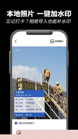 提供从移动设备本地相册导入已有图片的功能,并可为这些历史照片添加符合当前规范的全新水印,实现对过往影像资料的标准化补录与整理。