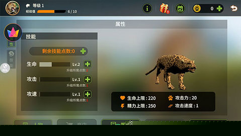 猎豹拥有独立属性系统,通过捕猎与战斗积累经验,可永久性提升速度、力量、耐力与狩猎技巧等核心能力。