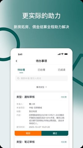系统集成了覆盖房产经纪业务全链条的审核类型,支持从房源信息、客户资质到交易合同等多维度的在线提交与审批,实现了审核流程的无纸化与即时化处理。