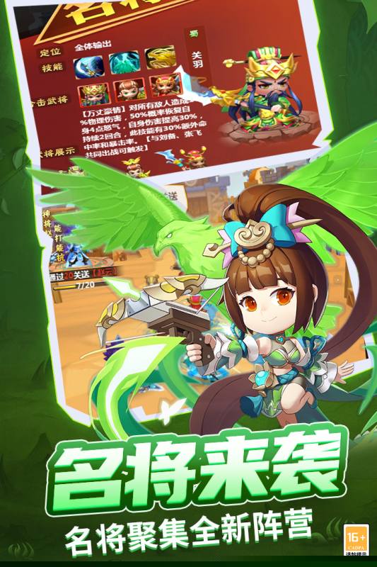 汇集了三国时期的众多传奇人物,每位武将拥有独特的技能与定位,可根据战术需求自由组建阵容,探索无穷的组合策略。