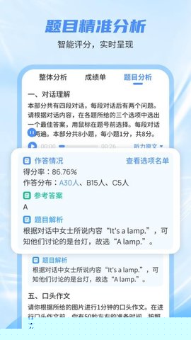 支持创建与发布包含跟读、模仿、问答等多种题型的听说作业。学生提交后,系统自动完成语音评测与打分,并给出发音、流利度等方面的具体反馈,减轻教师重复性批改负担。