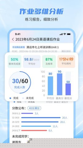 依托语音识别与数据分析技术,对学生的听说作业进行自动评分与错误诊断,生成可视化的班级学情报告,清晰呈现知识薄弱点。
