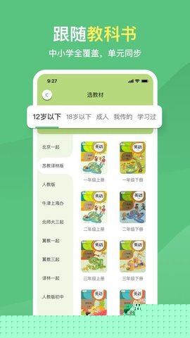 兼容国内多个主流出版社的中小学英语教材,如人教版、外研版、牛津版等。在软件内的教材中心可查看并选择所有已支持的版本。