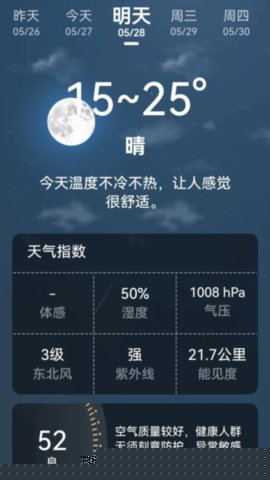 集成空气质量指数、紫外线强度、花粉浓度、湿度舒适度等多维度环境参数,提供健康出行综合评估。