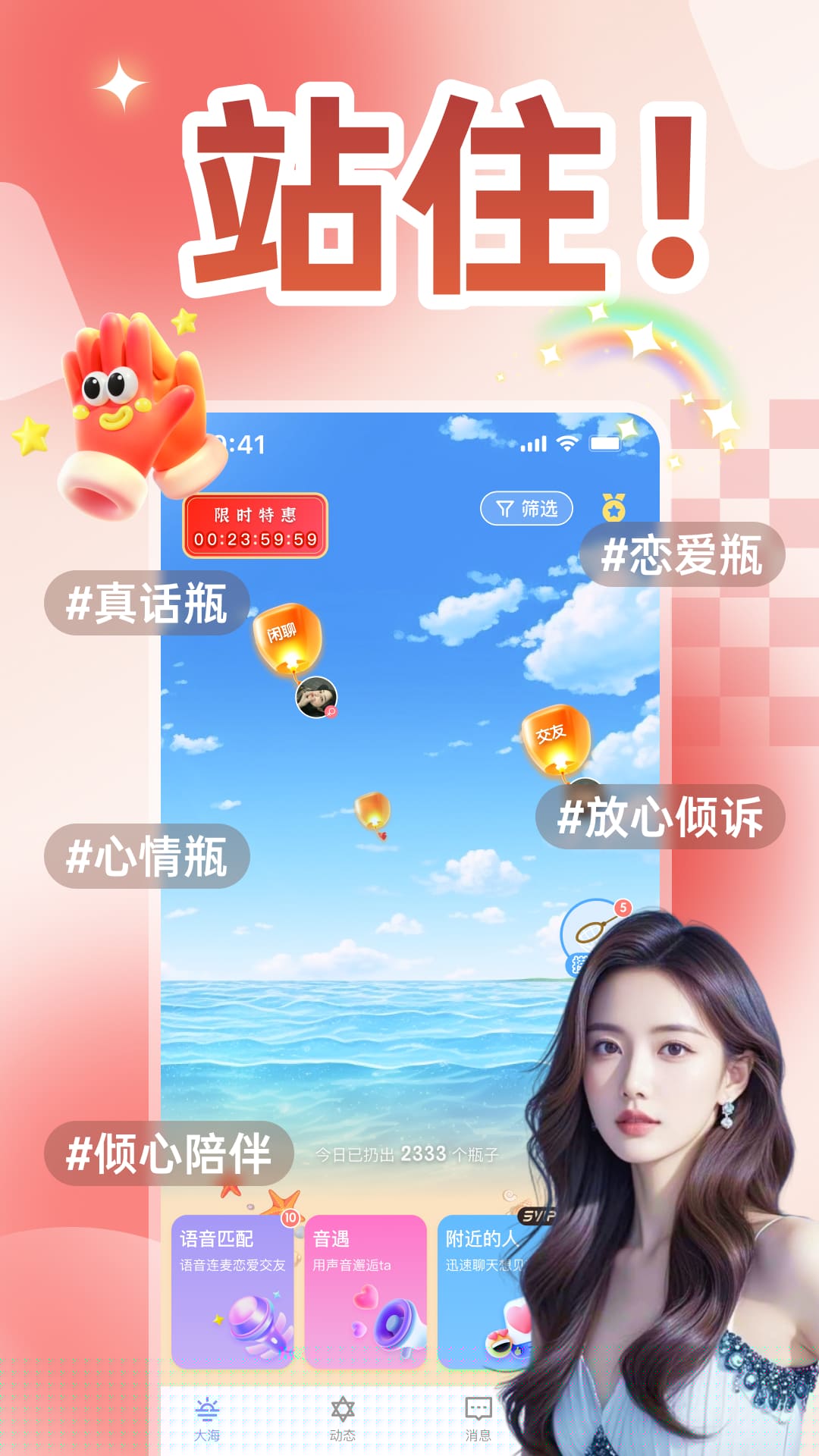 瓶洞树洞漂流瓶是一款由天津欢我网络科技有限公司研发的移动端匿名社交应用巧妙地将传统漂流瓶的浪漫构想融入数字时代,构建了一个兼具私密性与开放性的情感交流平台。将文字或语音信息封装成虚拟漂流瓶投入数字海洋,由系统随机匹配给其他用户拾取并开启对话。这种设计复现了未知邂逅的惊喜感,更在现代快节奏生活中开辟了一个无需背负现实身份压力的树洞空间,无论是分享生活片刻、倾诉内心困扰,还是寻觅一个安静的倾听者,都能在此获得真诚的回应与连接。