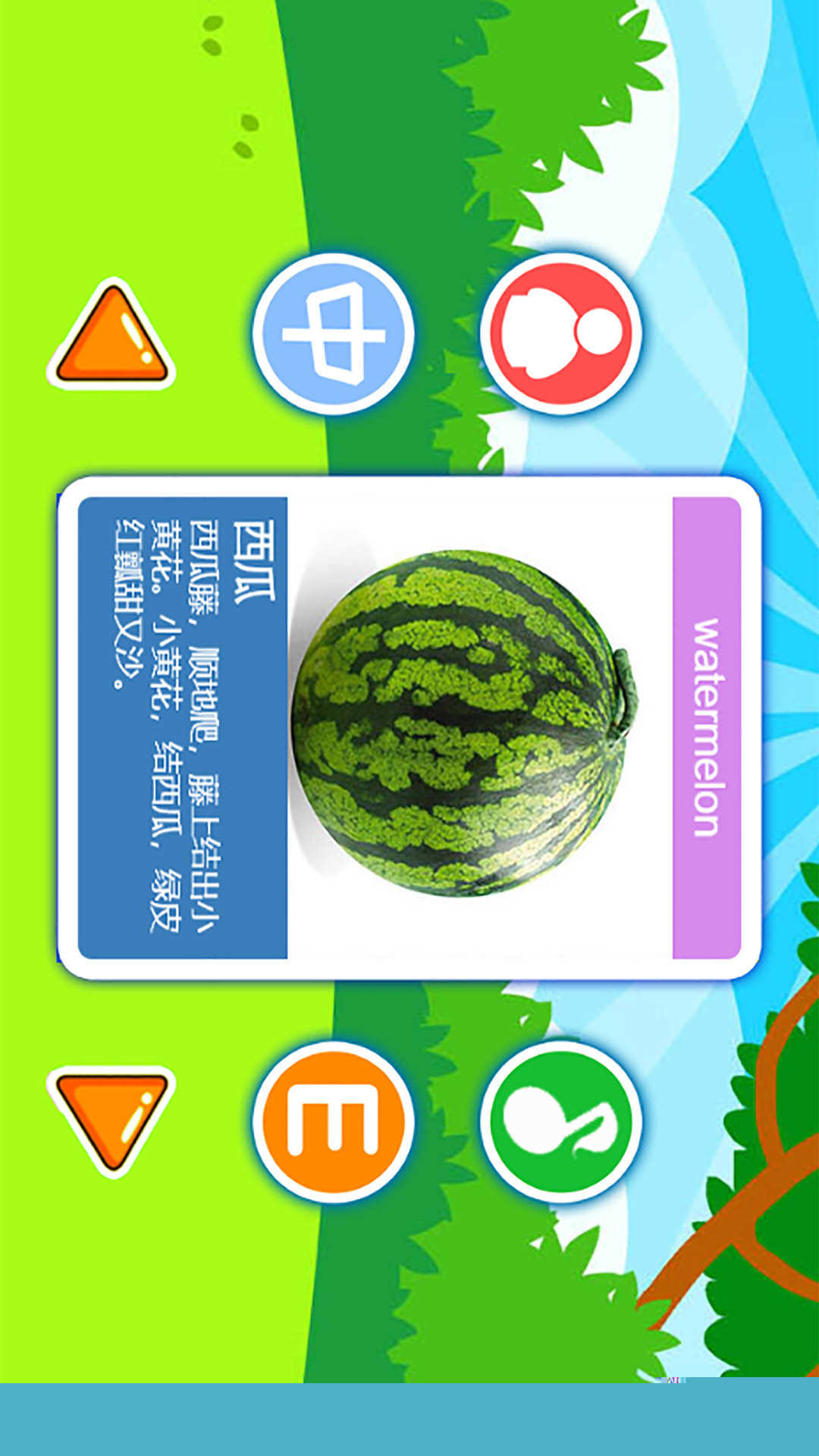 集成标准中英文发音的水果与蔬菜图鉴,在互动中建立语言与实物的早期关联。