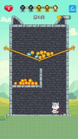体验的核心目标是操纵场景中的木棍,改变道具的支撑状态,最终使所有指定收集物(如钻石、金币)准确落在下方的小猫角色身上。每一根木棍的移除顺序都至关重要,错误的操作可能导致收集物坠入火海或偏离轨道,导致挑战失败。