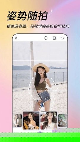内置丰富的真人实拍姿势模板库,覆盖单人、双人及多人合影场景,为用户提供从构图到肢体动作的全程可视化引导,有效解决拍照时姿势匮乏、表情僵硬的痛点。